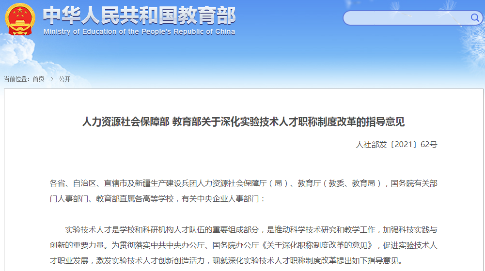 2021年8月9日人力资源社会保障部 教育部联合发布了《关于深化实验技术人才职称制度改革的指导意见》,明确举措,部署推进实验技术人才职称制度改革工作。