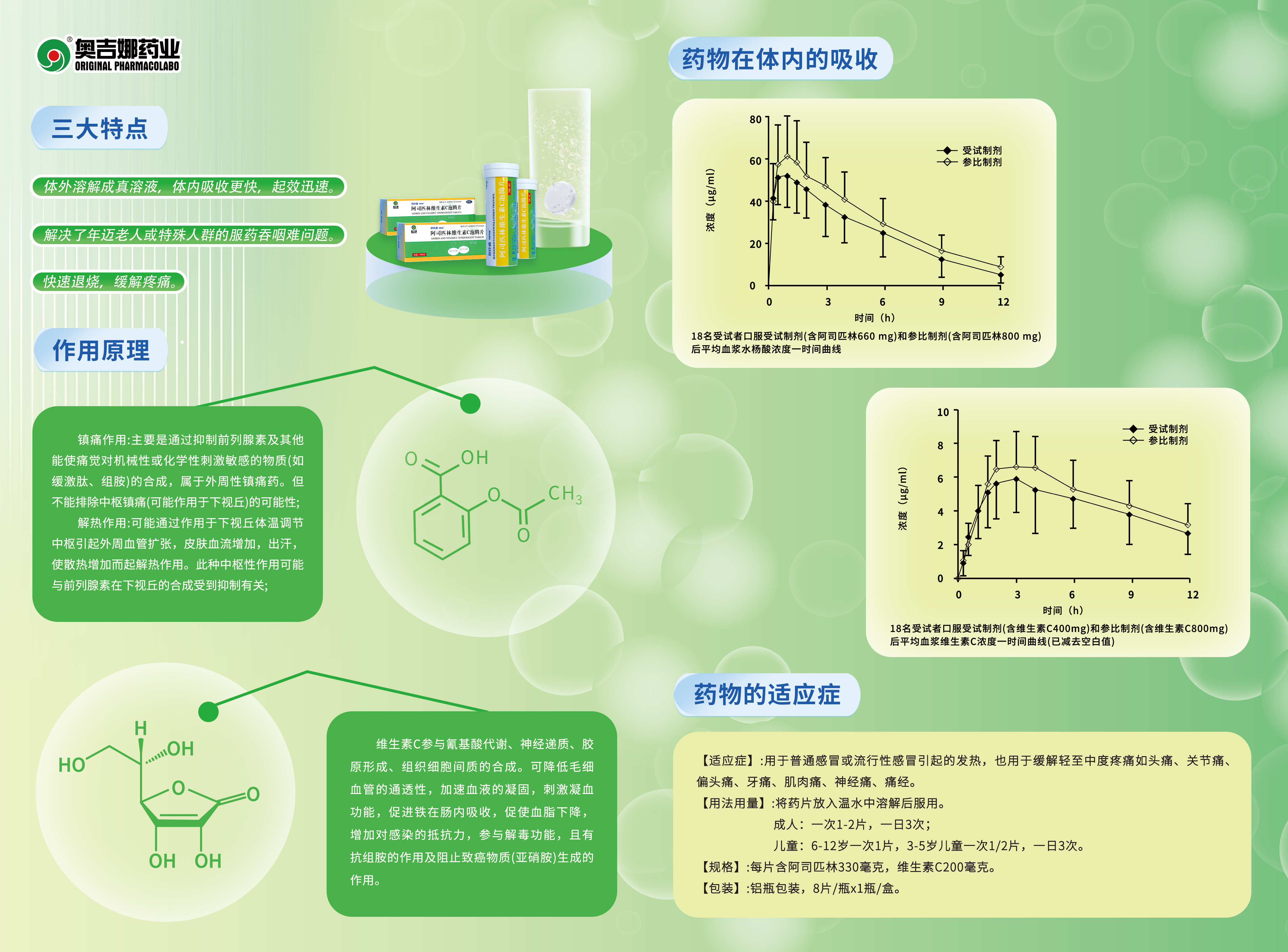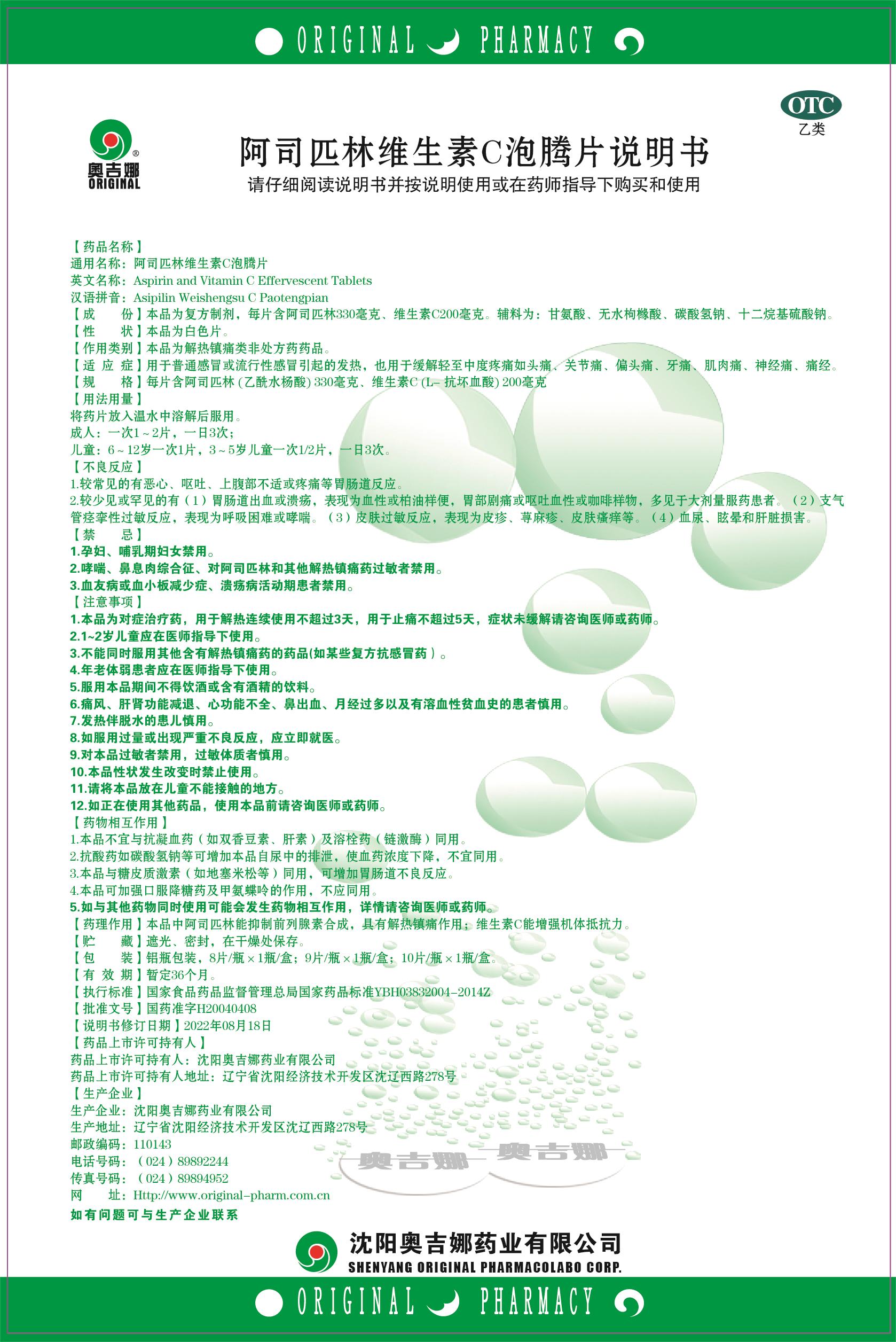 【成 份】 本品为复方制剂,每片含阿司匹林330毫克、维生素C200毫克。辅料为:甘氨酸、甘露醇、枸橼酸、碳酸氢钠、聚维酮K30。