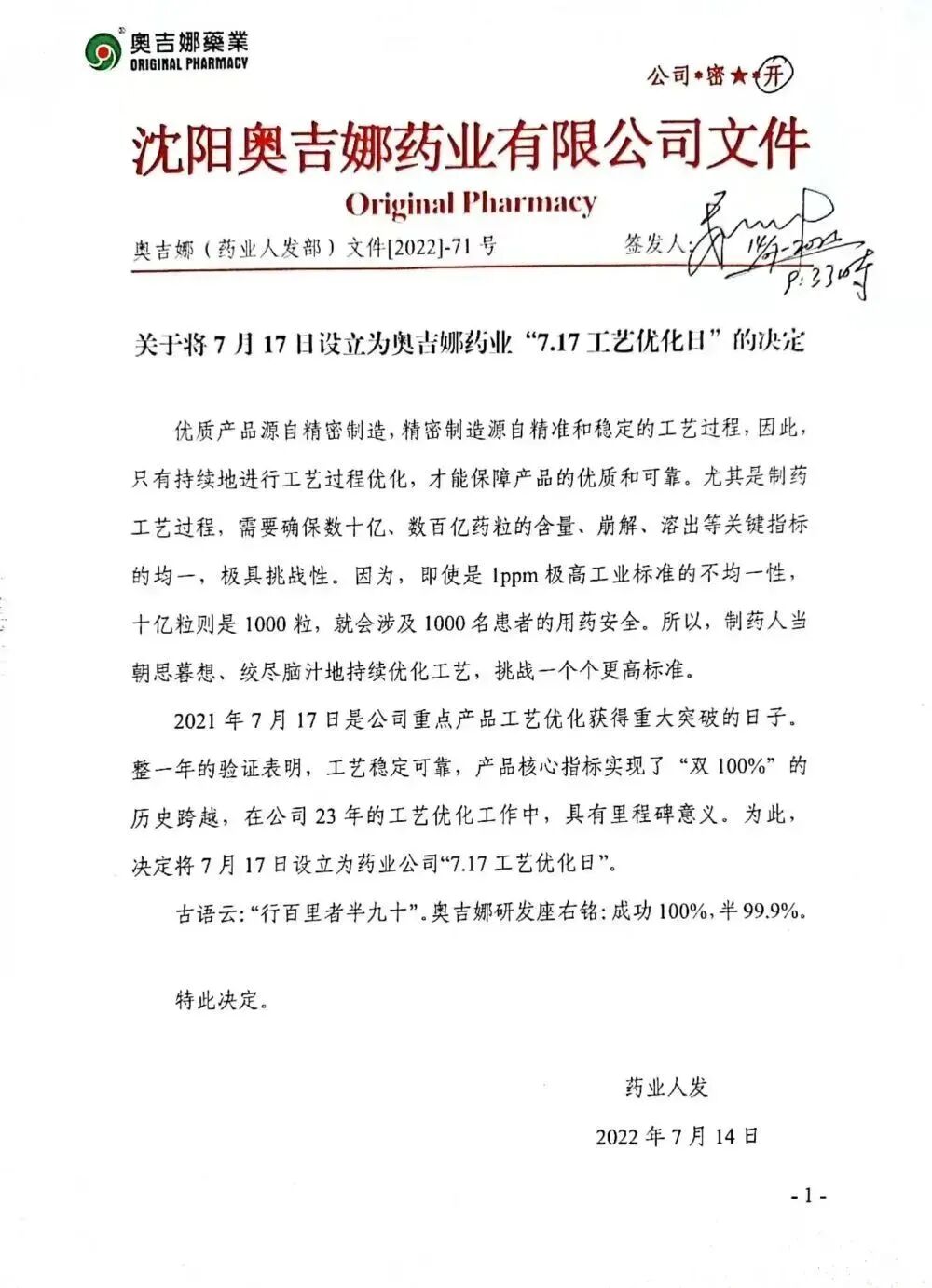制药之道,其艰其难,相当于要将数十亿乃至百亿药粒驯服于同一标准。回望2021年7月17日,奥吉娜的工艺探索迎来破晓之光 —— 一项重大工艺优化经一整年严苛验证,产品核心指标实现了“双100%”的历史跨越。这座里程碑,为二十三年工艺优化长卷添上了浓墨重彩的一笔。为纪念这历史性的一刻,奥吉娜药业决定将这一天定为“7.17工艺优化日”。